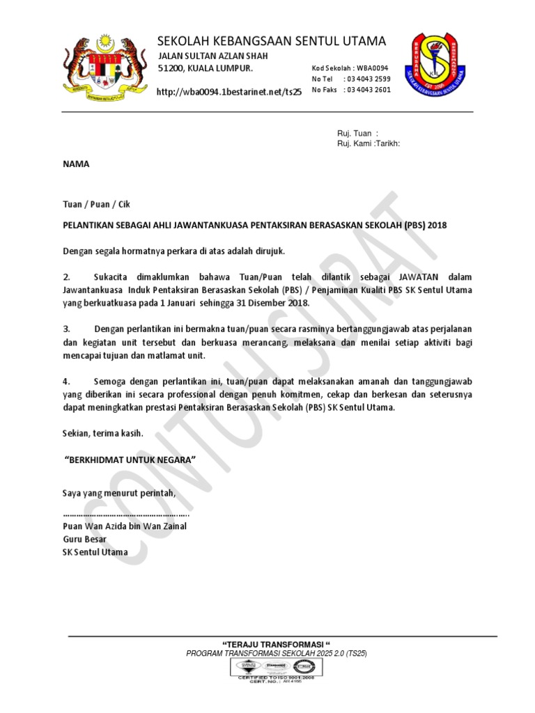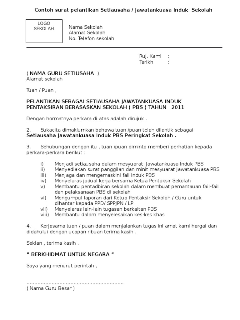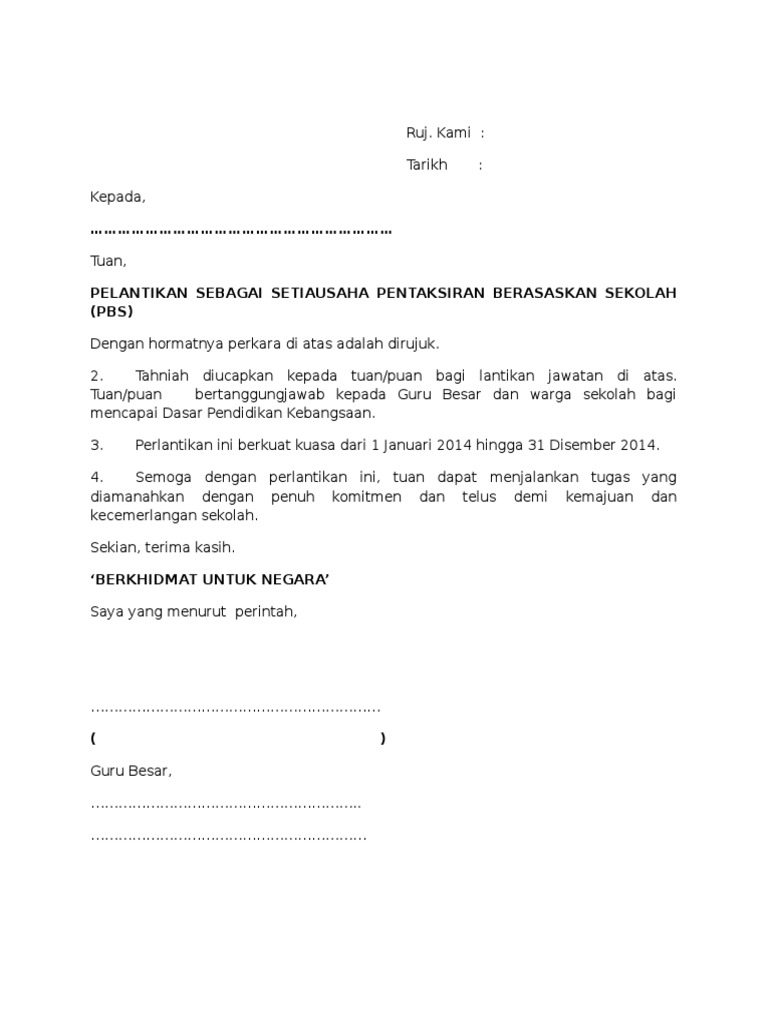 Hanya pdf jpeg jpg atau png dibenarkan. Contoh Surat Lantikan AJK Pentadbiran HEM Ko ku. TuanPuan PELANTIKAN PENTAKSIR SEKOLAH PENTAKSIRAN BERASASKAN SEKOLAH PBS TAHUN 2015.